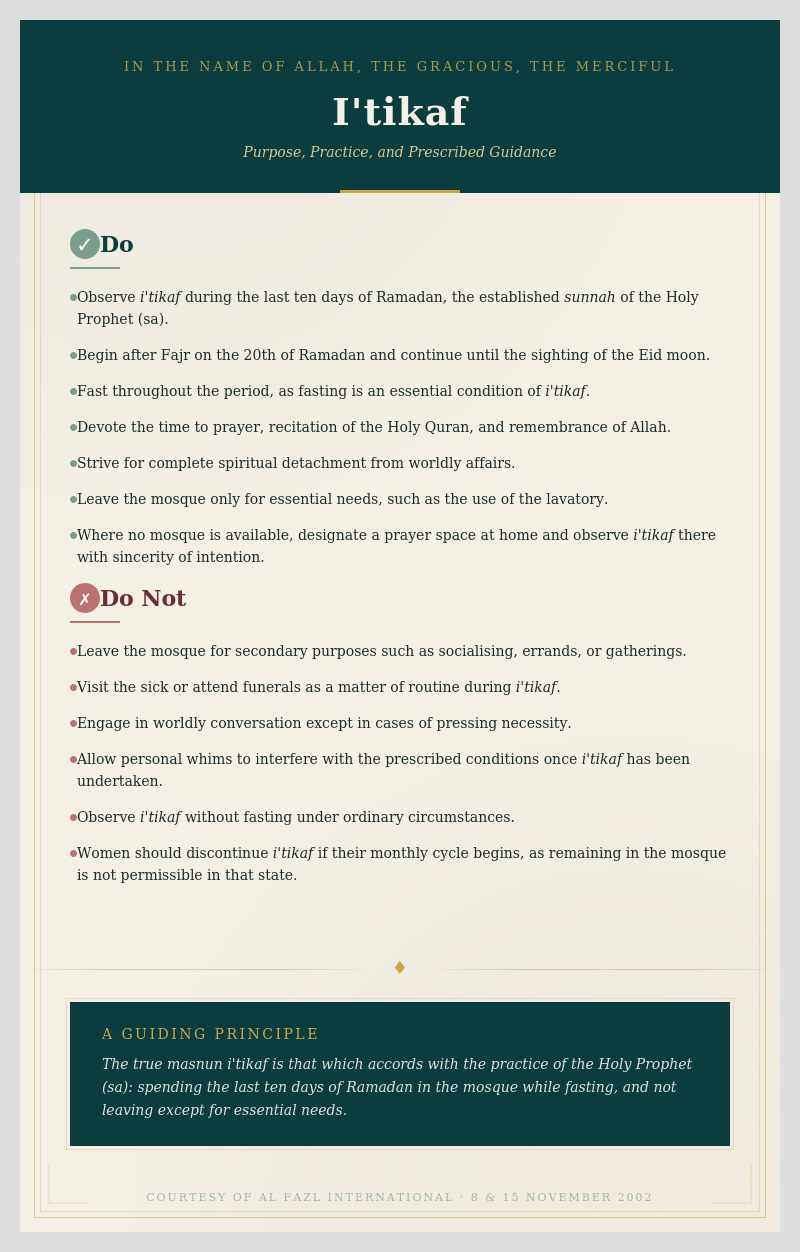 - Do not leave the mosque for secondary purposes such as socialising, attending gatherings, or running errands.