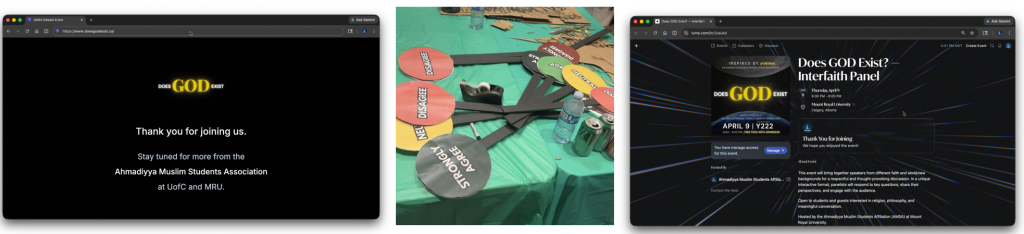 Overall, “Does GOD Exist? Inspired by Jubilee” was a clear success for AMSA MRU. It drew a strong turnout, attracted a substantial non-Ahmadi audience, filled the venue, and created a respectful setting for serious discussion on campus. Just as importantly, it demonstrated that AMSA MRU is once again capable of organizing thoughtful and impactful programming at Mount Royal University. As the club’s first major event in many years, it established a strong foundation for future initiatives and reflected the value of combining careful planning, technical preparation, campus outreach, and interfaith dialogue. Alhamdulillah, the event was an important step forward in restoring AMSA MRU’s visibility and presence on campus.