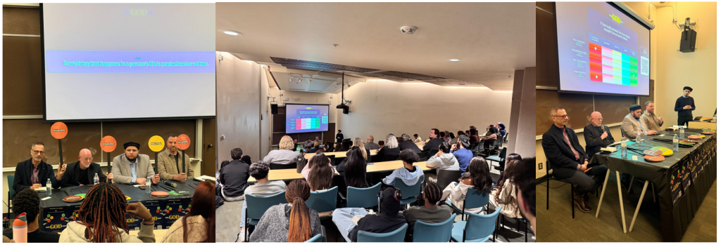 Preparation for the event also required substantial technical and logistical effort. Drawing from the broader “Does GOD Exist?” initiative, volunteers worked extensively on the custom www.doesgodexist.ca platform, which had been developed from scratch to support the Jubilee-style format. The platform was built because no existing online system could properly accommodate the interactive structure envisioned for the event, including live prompt display and a visual spectrum of responses. This same platform had previously been used at UCalgary’s event, and members from both MRU and UCalgary were involved in preparing it for use. Considerable time was spent refining, testing, and adapting the system for practical implementation. Volunteers also finalized the event flow, prepared the visual materials, and hand-crafted the physical signs used by panelists during the discussion. Support from AMSA UCalgary was instrumental in this process, and several improvements based on feedback from the earlier UCalgary event were incorporated into the MRU program, including a stronger emphasis on audience questions, clearer pacing, and the use of timers for each prompt.